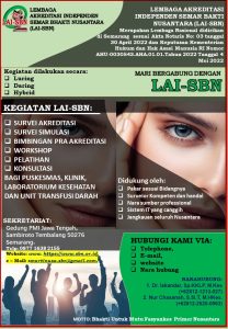 Sehubungan dengan kebijakan Kementerian Kesehatan Republik Indonesia, terkait akan kembali dilaksanakannya  kegiatan akreditasi FKTP oleh Lembaga Akreditasi Independen, Lembaga Akreditasi Independen Semar Bhakti Nusantara (LAI-SBN) yang didirikan di Semarang  sesuai :